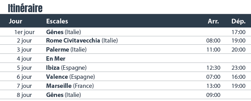 - Trajet en car spécial tout confort de votre lieu de départ à Gênes et retour