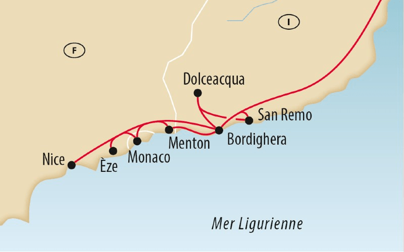 Mer bleu azur, vieilles villes aux couleurs pastel, palmiers, lavande et citrons – entre l’Italie et la France, la Méditerranée s’affiche sous son plus beau jour! Nous découvrons d’élégantes stations balnéaires, des villages pittoresques et des boulevards mondains – et profitons du soleil, de la joie de vivre et de la dolce vita à Bordighera, le plus beau balcon de la Riviera. Et tout cela à un prix exceptionnellement avantageux!