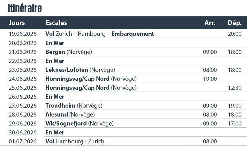 Lacs pittoresques lovés entre montagnes et glaciers imposants, fjords vert émeraude et impressionnantes cascades, le superbe littoral norvégien déroule d’inoubliables paysages parmi les plus fascinants du globe. Au légendaire Cap Nord, nous profitons d’un panorama à couper le souffle sur l’océan Arctique et assistons en direct au spectacle naturel du soleil de minuit. Cet environnement unique associé à des villes idylliques et à un petit détour par les îles Lofoten fait de cette croisière une expérience exceptionnelle. Embarquez avec nous et réservez dès maintenant votre cabine au prix pour réservation anticipée!