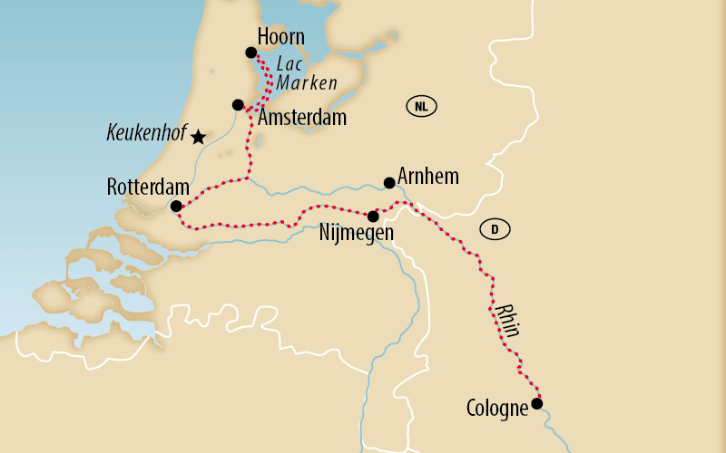 Au programme du jour, un passionnant tour de Rotterdam – à la découverte de son architecture moderne emblématique et de son impressionnant marché couvert. L’après-midi, nous rejoignons Lisse pour la visite du Keukenhof, le plus célèbre parc floral du monde. Les millions de tulipes et de fleurs printanières font de cette visite une expérience inoubliable.