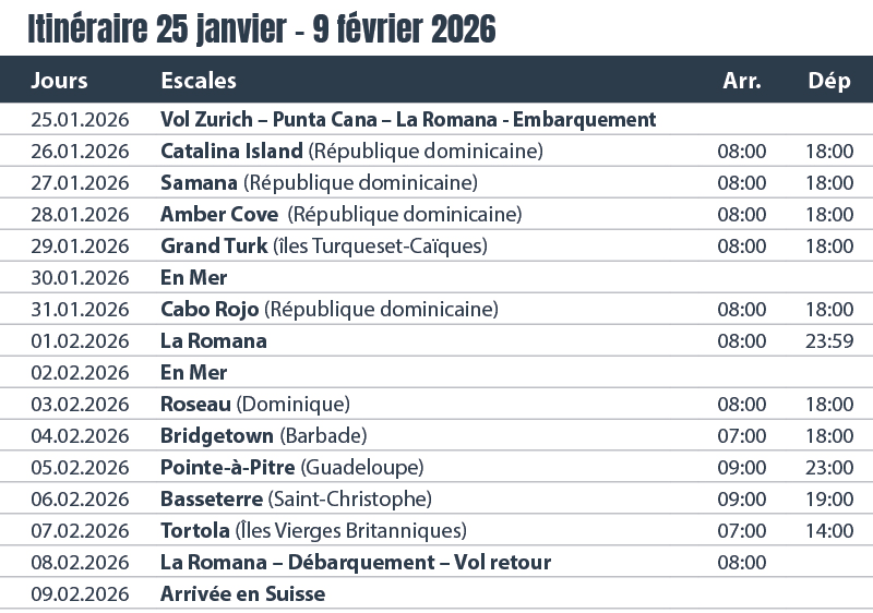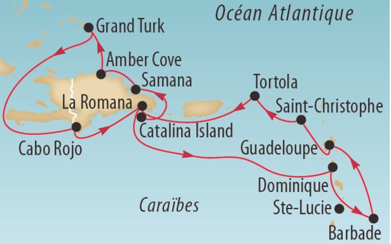 2e jour: en mer / 3e jour: Grand Turk / 4e jour: Puerto Plata / 5e jour: Samana / 6e jour: Catalina Island / 10e jour: Castries (Ste-Lucie)