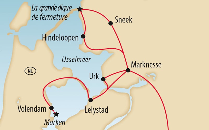 Découvrez la beauté des Pays-Bas de façon insolite: entre mer et polders, vieilles villes marchandes et ports animés. Du charmant village de pêcheurs de Volendam aux moulins à vent et digues de l’IJsselmeer en passant par la presqu’île de Marken, plongez dans l’univers des marins, des commerçants et des constructeurs hydrauliques – là où la Hollande est la plus typique!