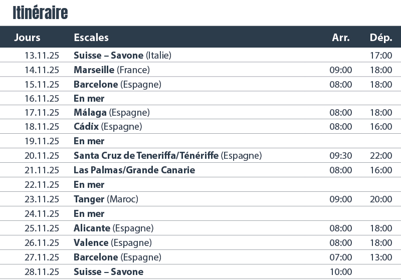 Notre itinéraire exceptionnel nous conduit via Marseille et Barcelone le long de la côte andalouse jusqu’à Malaga et Cadix. Ténériffe et la Grande Canarie séduisent par la douceur de leur climat, leurs paysages de rêve et leurs vastes plages qui invitent à la baignade. À Tanger, nous nous laissons envoûter par l’ambiance orientale et partons à la découverte des marchés colorés. Pour couronner notre croisière, nous flânons dans la vieille ville historique de Málaga et nous régalons de vin et de tapas à Valence. Profitez dès maintenant de nos prix promos exceptionnels sur le Costa Toscana et assurez-vous votre place au soleil.
