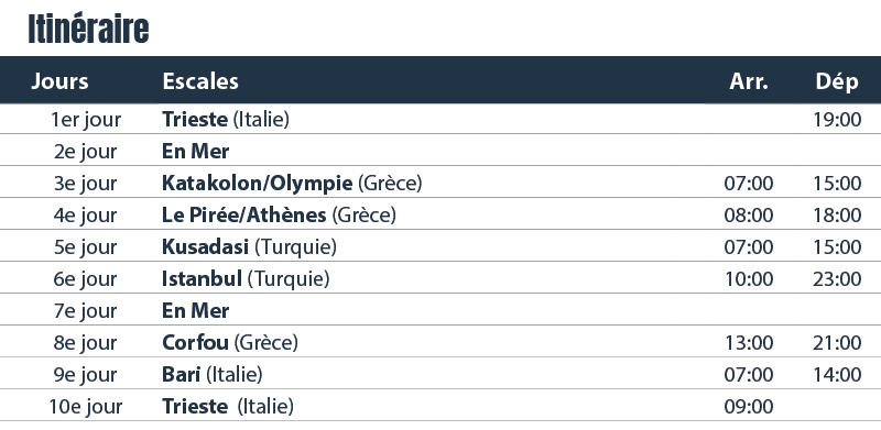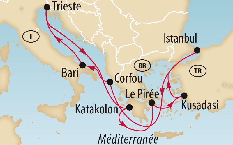 Via Katakolon et Athènes, notre magnifique itinéraire exclusif nous conduit dans la métropole turque d’Istanbul. A cheval entre l’Europe et l’Asie, la ville sur le Bosphore offre un condensé unique d’histoire, de culture et de modernité. Nous allons flâner dans le bazar haut en couleurs de Kusadasi, nous laissons envoûter par l’ambiance de Corfou et admirons l’Acropole de près. Ce voyage est une parenthèse unique au coeur d’une architecture exceptionnelle et des paysages de rêve. Assurez dès maintenant votre place au soleil à la meilleure période de l’année!