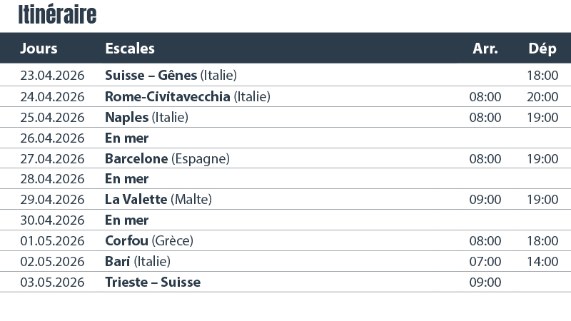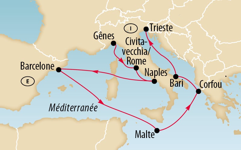 Découvrez le printemps en Méditerranée sous son plus beau jour lors de cet itinéraire unique autour de l’Italie. Nous explorerons les métropoles culturelles que sont Rome, Naples et Barcelone avant de rejoindre La Valette, l’impressionnante capitale de Malte. À Corfou, nous profiterons de l’hospitalité grecque au coeur d’une nature luxuriante, tandis que Bari nous enchantera avec sa charmante vieille ville. Réservez dès maintenant votre place au soleil – plaisirs méditerranéens inclus!