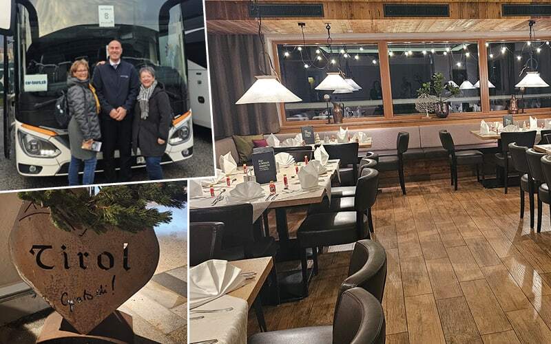 Um 15.30 Uhr fahren wir dann mit dem Bus weiter zu unseren Hotels in St. Johann. Gerne wären wohl noch einige Gäste ein bisschen länger in Innsbruck geblieben, um die Lichter des Weihnachtsmarktes zu bewundern – doch Besnik, unser Chauffeur, muss seine vorgeschriebenen Fahrzeiten einhalten. Bei Tageslicht können wir aber noch die Fahrt ins Tirol geniessen.
