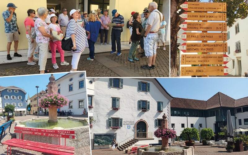 Bozen, Wein – dies steht heute auf unserem Programm. Wir starten am Bozner Dom, einem gotischen Schmuckstück mit kunstvollen Fresken und einem mächtigen Glockenturm. Am Waltherplatz wird natürlich ein Erinnerungsfoto geschossen – unser Gast Walter muss da einfach mit aufs Bild! Durch die Laubengasse, die schattige Flaniermeile mit ihren Arkaden, spazieren wir weiter. Gertrud kennt hier jede Ecke und jede Geschichte. Besonders charmant: Die Anekdote vom Gasthof «Roter Adler», der irgendwann zum liebevoll genannten «Vögele» wurde. Südtirol eben traditionsreich. Nach etwas Freizeit und Mittagspause fahren wir zum Kalterer See, heute besonders voll, denn bei dieser Hitze sehnt sich jeder nach Wasser.