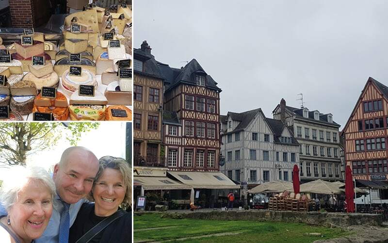 Am nächsten Morgen fuhren wir ins Zentrum von Rouen, wo wir Brigitte trafen, unsere ortskundige Reiseleiterin für zwei Tage Normandie. Wir spazierten als erstes durch Rouen, die den Spitznamen „Stadt der 100 Kirchtürme“ trägt. Die Kathedrale Notre-Dame von Rouen hat sogar den höchsten Kirchturm Frankreichs. Er ist 151,5 m hoch und etwas ungewöhnlich aus Gusseisen. Der frühere Turm ist bei einem Feuer verbrannt und mit Gusseisen sollte dies nicht mehr passieren. Die Kathedrale ist Krönungsort und Grablege der normannischen Herzöge und zählt zu den bedeutenden Kirchenbauten Frankreichs im gotischen Stil. Ihre Historie geht vom 3. Jahrhundert zurück bis heute und ist ein wahres Geschichtsbuch! Der erste Herzog der Normandie, der Wikinger Rollo sowie das Herz von Richard Löwenherz sind hier begraben. Richard Löwenherz hatte viele Titel, war Graf, Herzog und König und da Rouen seine Lieblingsstadt war, wollte er sein Herz hier begraben haben. Sein Körper ist jedoch mit seiner Familie in Zentralfrankreich begraben. Die Fassade der Kathedrale ist ungewöhnlich breit und mit ihrem weiteren „Butterturm“ weltberühmt, da der Vater des Impressionismus, Claude Monet, sie 27 mal in verschiedenem Licht gemalt hat. Der 75 Meter hohe Butterturm erhielt seinen Namen von einer Aktion des Domkapitels. Zur Fastenzeit war es verboten, Butter oder andere Milchprodukte zu verzehren. Mit einer einzigen Ausnahme die vom Domkapitel verkaufte Butter. Die Einnahmen von dem Butterverkauf verwendete man für den Bau dieses Turmes.