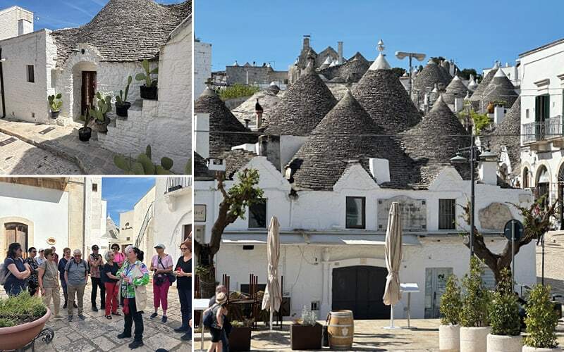 «Wie gern würde ich mich in deinem Blick verlieren. Mit dir die Welt der Realität vergessen. Schwebend über die Wolken von einem Traum zum nächsten fliegen». Ja, heute fliegen wir nach Brindisi! Die Swiss hat am Vorabend gemeldet, dass unser Flug um 4 ½ Stunden verspätet sein wird. Dank der guten Vorbereitung des Büros kann ich diese Flugverspätung meinen Gästen mitteilen. Warum denn diese Verspätung? Die Fluglotsen in Brindisi haben ihres Erachtens zu wenig Lohn und wollen ihre Forderungen so durchsetzen. Am Gate in Zürich hatten wir so unser erstes Thema und voller Erwartung steigen wir ins Flugzeug, das uns in knapp zwei Stunden nach Brindisi bringt. Beim Ausgang erwartet uns die lokale Reiseleiterin Annalisa. Sie wird uns die nächsten Tage in Apulien begleiten. Nach gut 90 Minuten sind wir im Hotel, in dem wir die nächsten Tage nächtigen und verwöhnt werden. Wir sind die einzigen Gäste im Hotel und werden wirklich verwöhnt. Müde und zufrieden legen wir uns schlafen und freuen uns auf den nächsten Tag. Auf dem Tagesprogramm steht Alberobello und Ostuni.