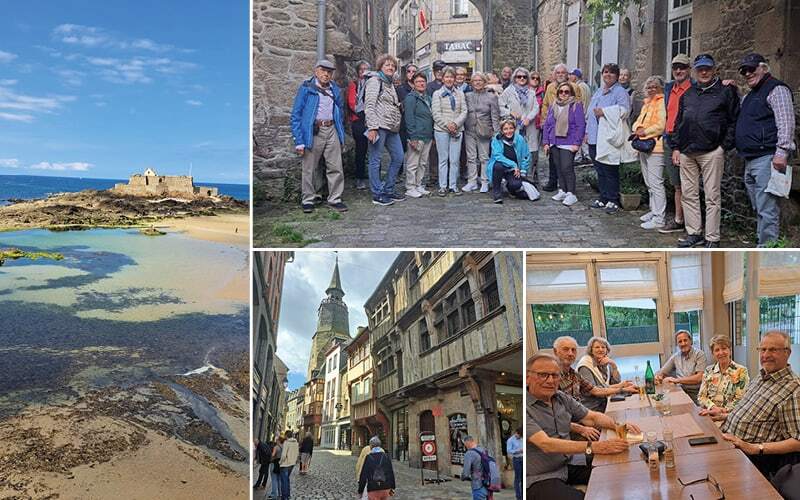 Am Abend erreichten wir unser Hotel in Concale, am Golf von Saint-Malo, in der Bretagne, von wo aus wir am nächsten Tag mit unserer lokalen Führerin, Catherine, zurück in die angrenzende Normandie fuhren, um in der blauen Meeresbucht den weltbekannten, einzigartigen Mont-Saint-Michel zu erkunden. Wer hat nicht schon Bilder gesehen von diesem berühmten, aus Granit bestehenden, bis zu 78 Meter steil aufsteigenden Felsen, umgeben von ausgedehnten Sandbänken, die bei hohen Gezeiten überflutet werden und die Landzunge zur Insel werden lassen. Wir konnten bei Ebbe über die lange Brücke gehen und die engen Gassen hochsteigen, um uns zwischen den mittelalterlichen Gebäuden, auf Plätzen und Burgmauern ein paar Jahrhunderte zurückversetzt zu fühlen und dabei eine tolle Aussicht geniessen.