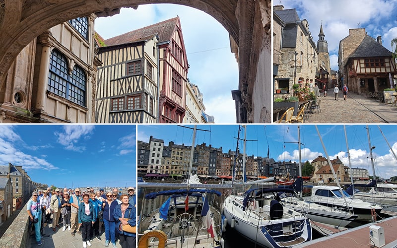 Danach ging die Fahrt durch das Département Calvados zum verlängerten Mittagshalt ins bezaubernde Hafenstädtchen Honfleur, am Ufer der Seinemündung. Dort ein Restaurant zu finden war gar nicht schwierig, sich für eines der sehr vielen Angebote zu entscheiden, schon eher, denn dieser Ort ist bekannt für die feinsten Spezialitäten der Normandie – allem voran frischem Fisch und Meeresfrüchten wie Austern, Tintenfisch, Kalmare, Krabben, Garnelen, Langusten und Hummer. Schwierig, sich zurückzuhalten in diesem exquisiten Schlemmerparadies! Aber kein Problem, Honfleur ist ein idealer Ort für einen ebenso genüsslichen Verdauungsspaziergang durch seine hübschen Gassen, vorbei an den schmalen pittoresken Fachwerkhäusern, entlang der Seine, zur ganz aus Holz gebauten mittelalterlichen Seemannskirche Sainte Catherine oder den Resten der Befestigungsanlage Lieutenance aus dem 17. Jahrhundert.