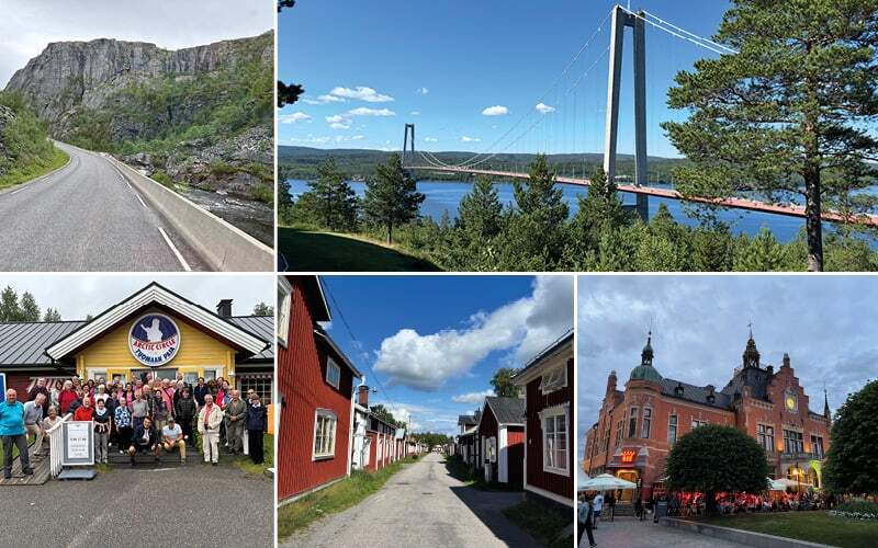 Zurück in Finnisch Lappland überquerten wir den Napapiiri (finnisch für Polarkreis) in südlicher Richtung. Vorbei an den Stromschnellen Kukkolankoski ging es zurück nach Schweden, ins grösste Land von Skandinavien. Alles dem Bottnischen Meerbusen entlang, über die Hogakustenbron, mit 1.8 Km Länge eine der grössten Hängebrücken der Welt. Hier spürt man die Landhebung sichtlich. Das Land erholt sich immer noch vom Druck des 3 Km dicken Eises während der letzten Eiszeit. Die langen Tage zeigten Wirkung auf unsere Gäste. Da mussten wir uns immer wieder mal was einfallen lassen, um unsere Gäste munter zu halten. Wir besuchten die WM-Sprungschanze von Falun, besichtigten die Schleusen des Göta-Kanals bei Motala, und ich freute mich sehr über die Wachhaltewirkung meiner Geschichten. Als weitere bleibende Erinnerung konnten wir, in einem Park, Elche von nahem sehen. Das grösste freilebende Wildtier Europas hatte es unseren Gästen definitiv angetan. Bei der Abschlussprüfung mit anschliessender Diplomierung wurden die Fragen zum Elch am besten beantwortet. Ich danke der Busfahrerin Andrea und dem Busfahrer Daniele für die gute Zusammenarbeit. Sie fuhren den neuen Zerzuben Bus souverän unter dem fast immer blauen Himmel.