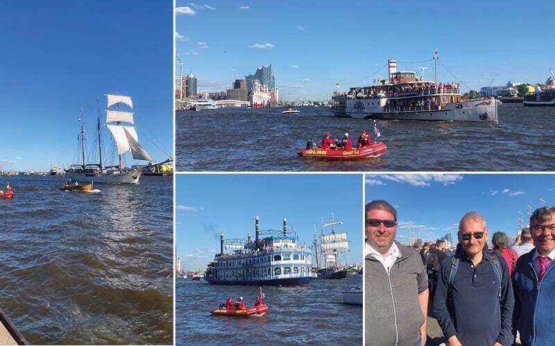 Ein besonderes Spektakel kündigt sich am späteren Sonntagnachmittag an. Alle Schiffe, die dem Hafen zu seinem Geburtstag einen Besuch abgestattet haben, fahren in einem Umzug elbeabwärts nochmals an den Tausenden von Festbesuchern vorbei. Grosssegler, historische Frachter, ein Mississipi-Dampfer und Kriegsschiffe verabschieden sich in einem Hupkonzert von Hamburg. Einen feuchten Eindruck hinterlässt ein Feuerwehrlöschschiff. Einige Mitglieder unserer Gruppe werden von seinen riesigen Wasserfontänen regelrecht geduscht.