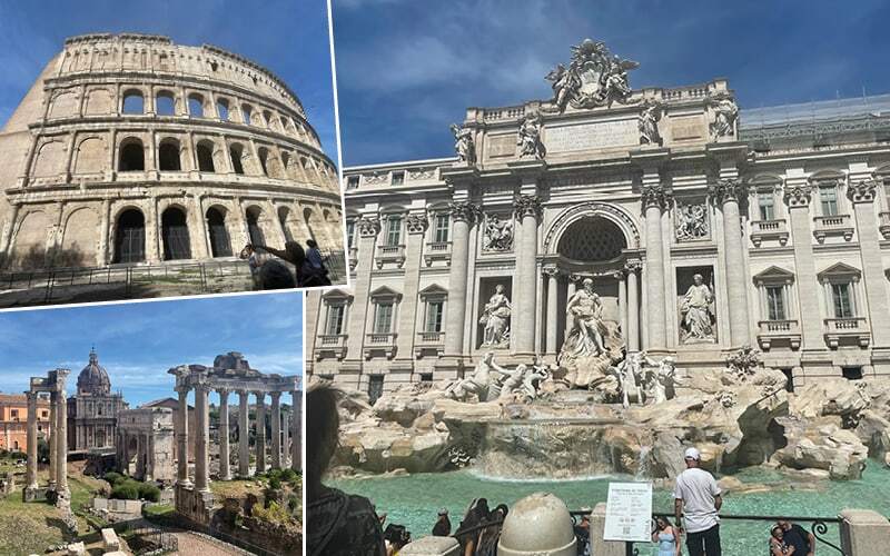 3. Tag – Who in Who in Rom gibt sich die Ehre: Colosseo – Forum Romanum – Monumento Vittore Emanuele II – Fontana di Trevi mit wohlverdienter Mittags- und Stärkungspause und der Möglichkeit, Münzen in den Brunnen zu werfen (1 Münze = Ich kehre nach Rom zurück, 2 = Ich verliebe mich, 3 = Ich heirate,  4 = Ich lasse mich scheiden).