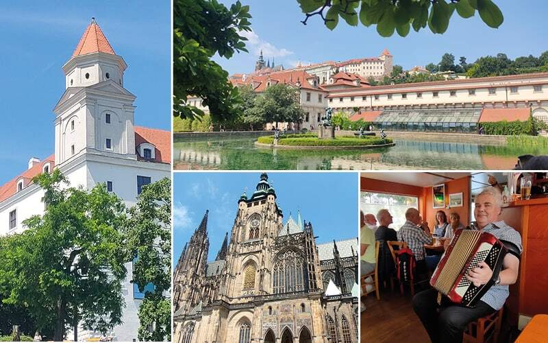 Am nächsten Tag zeigt uns unsere Stadtführerin Sona die Highlights der Stadt. Wir besuchen die Prager Burg, schlendern über die Karlsbrücke bis in die Altstadt, bei den heutigen warmen Temperaturen doch sehr anstrengend für viele. Doch mit etwas Hilfe der ganzen Gruppe schaffen es auch Viktor und Maria locker ans Ziel und wir genießen den freien Nachmittag. Später ist dann unser Treffpunkt gegenüber dem Rathaus, eigentlich sehr einfach zu finden, doch Urs fehlt! Heute hat es aber auch besonders viele Leute auf dem Platz, denn es findet hier gerade die Eröffnungszeremonie des Internationalen Dance World Cup mit 9500 Tänzern statt. Also nicht ganz so einfach, sich hier durchzukämpfen, doch schließlich stößt er dann auf uns und wir gehen zu unserem Schiff. Der Abend auf der “Klara” mit feinem Abendessen und nostalgischer Musik von Philharmoniker Pavel ist der perfekte Abschluss unserer Reise. Morgen früh geht es zurück in die Schweiz und Thomas und ich nehmen Abschied von unserer wunderbaren Reisegruppe und sagen: