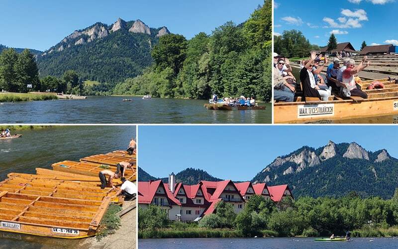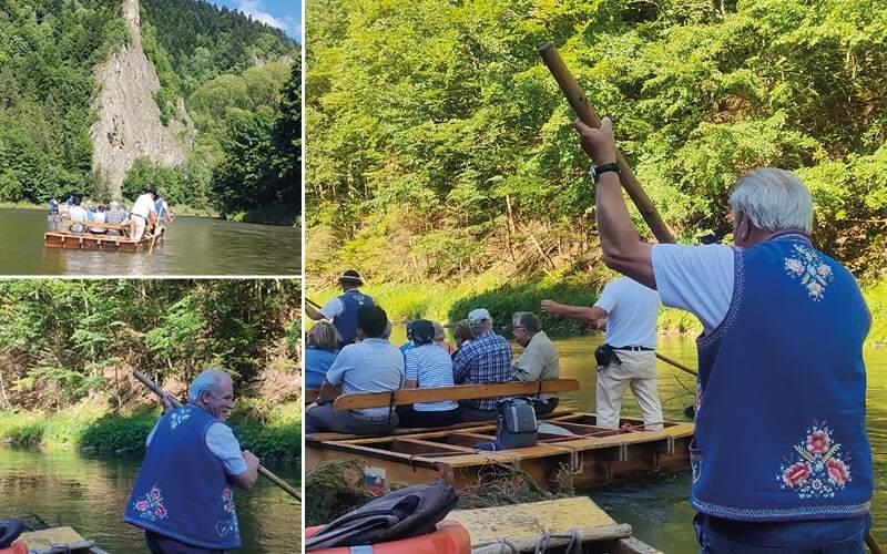 Tags darauf fahren wir zum kleinsten der neun Nationalparks der Slowakei, dem Pieniny-Nationalpark, an der Grenze zu Polen. Unser erstes Ziel ist das Rote Kloster in Červený Kláštor, wo wir eine faszinierende Führung durch dieses historische Schweigekloster genießen. Alice kann kaum glauben, dass die Mönche hier täglich nur eine Stunde sprechen durften. Nach der Besichtigung machen wir uns auf den Weg zur Floßanlegestelle. In einer gemütlichen slowakischen Gaststube genießen wir das schöne Wetter und stärken uns, bevor wir nach ziemlicher Verspätung auf die Flöße steigen dürfen. Die Floßfahrt auf dem Dunajec ist ein besonderes Erlebnis: Auf 9 km genießen wir die traumhafte Natur, während Max und Turi sich als mutige Floßfahrer versuchen. An der Anlegestelle warten Pferdekutschen auf diejenigen, die die kurze Strecke zum Bus nicht laufen möchten. Zurück im Hotel entspannen wir uns bei einem weiteren leckeren Buffet.