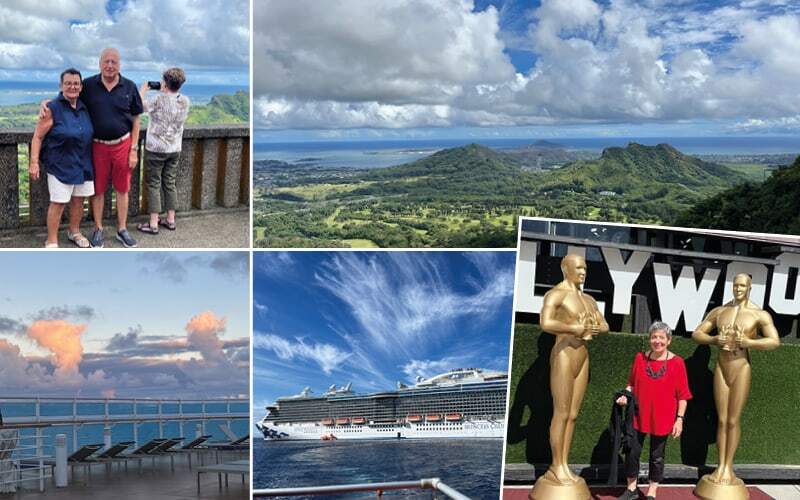 Am späten Abend nimmt die Royal Princess Kurs auf Hawaii. 5 Seetage bis dahin. Endlich können wir die ersten Eindrücke verarbeiten. Anfangs ist das Wetter noch etwas unbeständig. Doch dann geht die Sonne richtig auf und jeden Tag wird’s wärmer. Schattenplätze sind, im wahrsten Sinne des Wortes, heissbegehrt. Wir verbringen unsere Tage lesend, schwatzend, lachend, sportlich, schwimmend oder ganz einfach im Sprudelbad. Auf Deck 17, vorne, gibt’s einen Pool nur für Erwachsene. Liegestühle im Schatten, eine Bar und eben, ein Schwimmbecken mit der Länge von ca. 10 Metern. Die Seetage vergehen schnell und schon sind war da: Honolulu…… ein eigenartiges Gefühl und wir sagen es uns immer wieder vor: H O N O L U L U