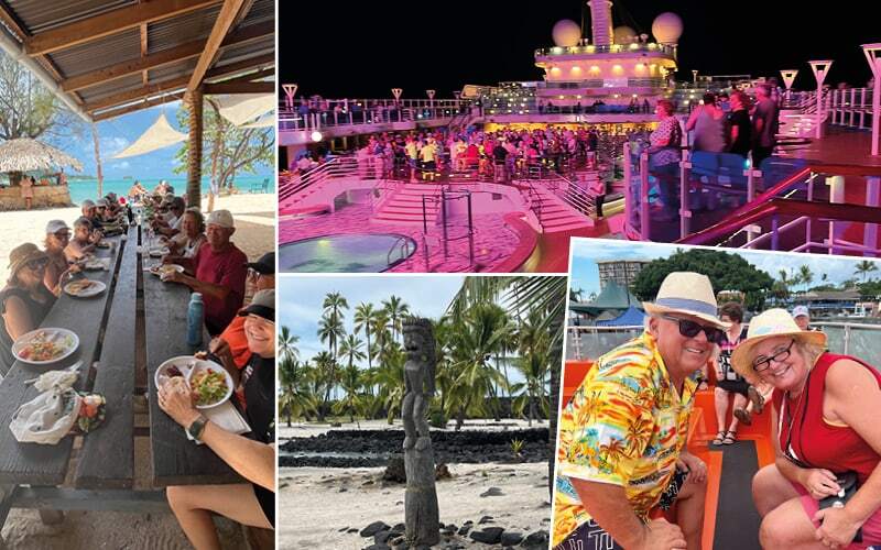 Von Honolulu geht’s mit der Royal Princess nach Hawaii, Big Island, in die Stadt Kailua-Kona. Der Hafen ist so klein, dass unser Schiff nicht anlegen kann, sondern auf Reede bleibt, d.h. am Anker. An Land werden wir mit unseren Tendern (Rettungsboote) gebracht. Irgendwie habe ich es geschafft, mit dem Schiff einen guten Draht aufzubauen. Wir können nämlich als erste Gruppe aufs Tender und an Land, während andere sich hintenanstellen müssen. Hier ist der Schweizer Bruno unser Reiseführer. Er und seine Frau leben seit ein paar Jahren auf der Insel und er schwärmt von seiner neuen Heimat. Er zeigt uns versteckte Schönheiten, eine kleine Holzkirche und Kaffee, welcher hier angepflanzt wird. Die Landschaft ist tropisch und immer wieder erfrischt ein kleiner Schauer die Fauna und Flora. Bevor wir zurück aufs Schiff müssen, lassen wir es uns aber nicht nehmen, noch am kleinen Strand zu baden. Und die obligaten Macadamia-Nüsse einzukaufen. Fünf weitere Seetage. Wir lassen die Seele baumeln und von der fantastischen Crew verwöhnen. Es wird immer heisser und drückender; wir sind am Aequator! Genau am 8. Oktober 24, um 11.47h haben wir den 0° Breitengrad überquert und Neptun kommt an Bord. Ein riesiges Spektakel mit Musik, Fischen, Meerjungfrauen und einer riesigen Sauerei. So eine Aequator-Überquerung muss gebührend gefeiert werden. Da wird nichts ausgelassen. Unsere Truppe schaut das mal lieber aus der Ferne an….