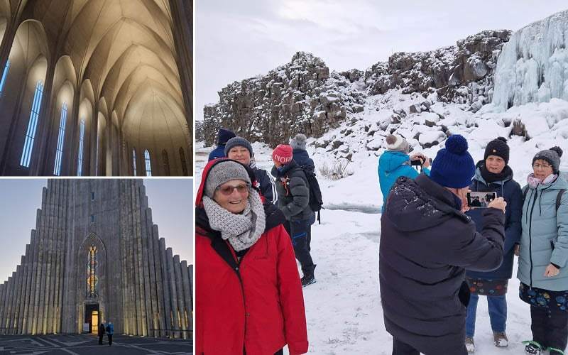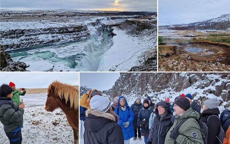 Der Goldene Kreis ist die berühmteste Route in Island. Er kombiniert atemberaubende Landschaften mit geschichtlich bedeutsamen Orten auf einer kreisförmigen Route. Marta und Emilio begleiten uns auch an diesem Tag mit Freude. Als erstes spazieren wir auf Schnee und Eis (wir erhielten auf Wunsch Spikes) im Pingvellir Nationalpark. Er ist der historische und geologische Schatz Islands. Von der Zeit der Besiedlung um 930 n. Chr. bis 1789 tagte hier das isländische Parlament Alpingi, und am 17. Juni 1944 proklamierte Island an diesem bedeutenden Ort seine Unabhängigkeit von Dänemark. Seit 2004 gehört Pingvellir zum UNESCO-Weltkulturerbe. Hier driften die tektonischen Platten auseinander. Die Spalten sind sowohl in der Almannagjá-Schlucht als auch in Silfra sichtbar, wo Leute zwischen den Kontinenten tauchen und schnorcheln.