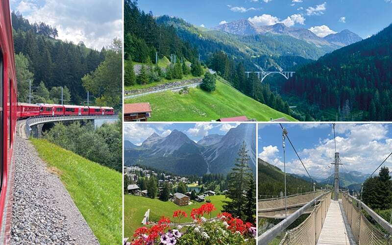 Aber schön ist die 60 minütige Fahrt durch das Schanfigg mit den ursprünglichen Walserdörfern und den süssen Stationsgebäuden. Immer wieder überqueren wir diePlessur mit abenteuerlicher Schienenführung durch das wilde Tal, über die grösste Brücke der RhB, dem Langwieserviadukt, welches schon vor über 100 Jahren gebaut wurde. Die 68 m hohe und 284 m. lange Brücke war die erste betonierte Eisenbahnbrücke der Welt.