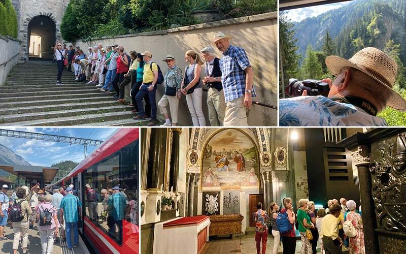 Gemütlich ist es, bis der Billeteur leider der Rheinschlucht die Show stiehlt. «Alle Halbtax und GA’s bitte»! Brav zeigen wir alle unsere Ausweise. «Das kann nicht stimmen»! Nochmals: «wer hat alles ein Halbtax? Wer hat ein GA? Lustig wars, die ersten Witze kamen über unsere Lippen. Wir halten an einer Station an und der uniformiert Herr Schaffner musste rausspringen. So, jetzt haben wir wieder Ruhe und können die Landschaft geniessen. Aber nein, wer kommt wieder in unseres Abteil? Unser RhB Bähnler. Nochmals: «wer hat jetzt definitv ein Halbtax und wer hat ein GA?» Von Neuem wird gezählt. Die Spassfaktor steigt bei uns immer mehr. Irgendwo muss es hier eine versteckte Kamera geben. Nach dem 4. Mal gab er es auf und liess uns ungeschoren ziehen mit 4 verschiedenen Anzahl gezählten Ausweise. Aber unser «running Gag» wird uns noch die ganze Reise begleiten und sorgt immer wieder für heiteres Gelächter.
