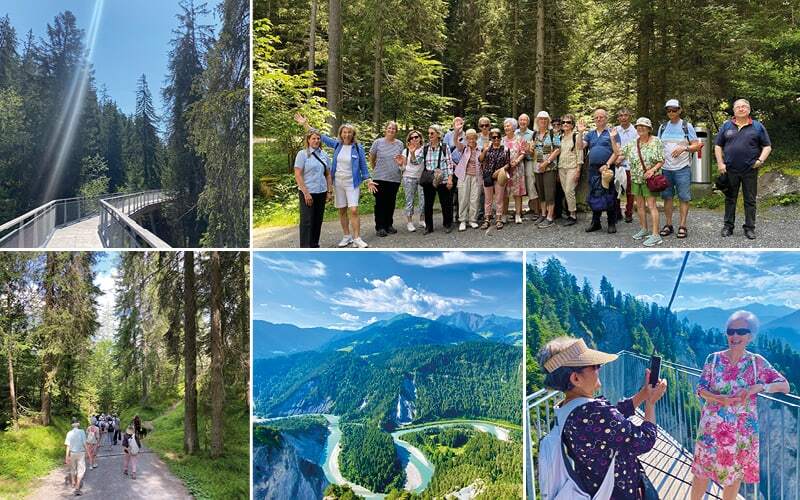 Lisa, unsere Spaziergangleiterin, führt uns zum Caumasee, anscheinend dem schönsten See der Schweiz und anschliessend erreichen wir mit einem lockeren Spaziergang den Höhepunkt dieses Tages: die Aussichtsplatform : «Il Spir» (rätoromanisch und heisst der Mauersegler. Genau so sind wir uns vorgekommen. Wir segelten über dem «Schweizer crand canyon», der 400 m tiefen Ruinaulta d.h. Rheinschlucht. Ja, leider ist diese Aussicht nur für die schwindelfreien Gäste erhältlich. Aber wenn man die Angst überwunden hat , wird man von einer überwältigenden Sicht auf den Rhein überrascht.