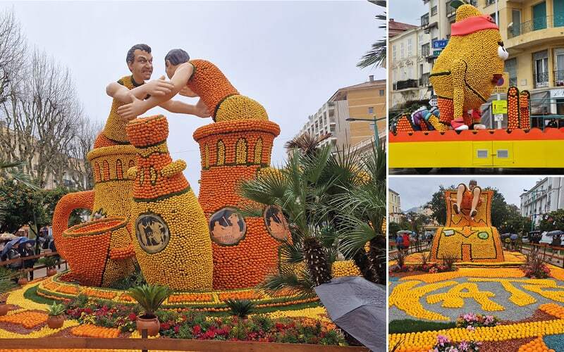 15 Tonnen Stahl halten diese Skulpturen aus bis zu 180 Tonnen Zitronen und Orangen zusammen. Zehn Tonnen Obst werden während des Festes ausgetauscht gegen Früchte, die gelitten haben. Sämtliche Früchte stammen heute aus Spanien, wo Zitronen en masse angebaut werden. Der Citron de Menton indes ist als fruit d’or, als eine Goldfrucht, eine geschützte wie geschätzte Spezialität, die nur in und um Menton reift – und damit in viel geringeren Mengen. Auch ist der Anbau auf Terrassen schwierig, bis heute Handarbeit und teuer. Mehr als fünf Euro kostet das Kilo der heimischen Zitronen.