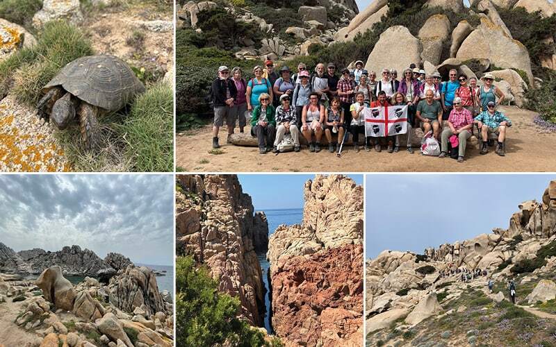 Am nächsten Tag dürfen wir während einer zweistündigen Busfahrt die nördliche Landschaft Sardiniens bewundern, mit Busch und Graslandschaft, kleinen Dörfern und immer wieder bizarren Felsen. Die Ziegen, aus deren Milch der berühmte Pecorino Käse hergestellt wird, sind rar. Sie leben hauptsächlich in Mittel- und Südsardinien. Unser heutiges Ziel ist Isla Rossa, mit den rötlichen, zerklüfteten Felsen, die uns während er ganzen Wanderung begleiten. Die Büsche sind heute nicht so hoch, dafür die Wege etwas holpriger und anspruchsvoller. Leicht erhöht folgen wir dem smaragdblauen Meer. Zusammen mit dem stahlblauen Himmel, den rötlichen Felsen, den grünen und den blühenden Büschen wieder eine einmalige Landschaft. Zum Glück ist das Zeitalter der Papierbilder vorbei, wir schiessen unzählige Bilder, eines schöner wie das andere. Die heutige Mittagspause ist inmitten der Felsen, mit der steinigen Costa Paradiso im Hintergrund. Ein wunderschöner Wandertag. Am Abend glühen einige Gesichter, nicht nur wegen dem Erlebten, sondern der Mittelmeersonne, die heute sehr intensiv war und selbst Sonnenfaktor 50 ignorierte.