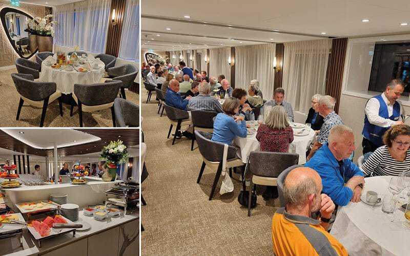 Die MS „Amadeus Riva“ wurde 2023 gebaut, ein junges Schiff also, ist 135 Meter lang (das Maximum an Länge, was ein Flussschiff haben darf) hat 4 Decks und Kapazität für maximal 158 Passagiere. Über 40 äusserst zuvorkommende, stets lächelnde Mitarbeiter, mehrheitlich aus Indonesien stammend, kümmerten sich 24 Stunden um uns und erfüllten uns, im Rahmen der Möglichkeiten, jeden Wunsch.