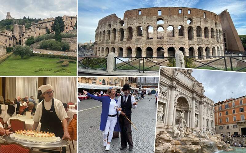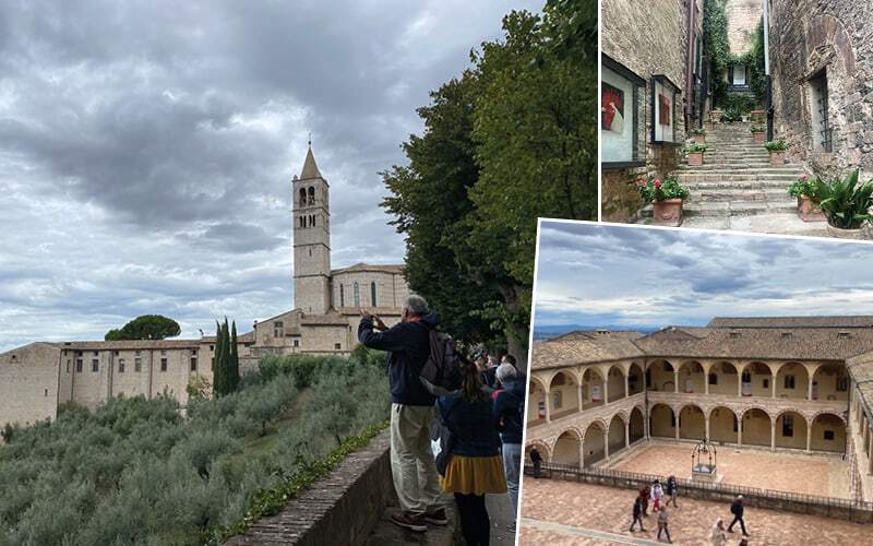 Die Stadt ist bekannt für ihre Schokolade. Hier gibt es eine berühmte Konditorei, die im Jahr 1860 von einem Schweizer gegründet wurde. Die Konditorei Sandri, eine der ältesten und bekanntesten Konditoreien der Stadt. Um uns zu überzeugen, dass die Schweizer/Italienische Schoggi noch besser ist als die unsrige, sind wir eingeladen in einer Confisserie um eine feine Schokolade in flüssiger Form zu geniessen mit ein paar süssen Biscuits. Anschliessend wird der ganze Laden von unserer Gruppe leergekauft. Vor dem Mittagessen fahren wir weiter nach Assisi, die Heimatstadt des heiligen Franziskus. Alle finden ein schönes italienisches Restaurant um sich zu stärken, bevor wir in das Leben von Franziskus von Assisi tauchen (1181 -1226). Er war ein italienischer Heiliger und Gründer des Franziskanerordens. Ursprünglich aus einer wohlhabenden Kaufmannsfamilie stammend, wandte er sich nach einer spirituellen Erfahrung dem Leben in Armut und Demut zu. Er widmete sich der Sorge um die Armen, der Einfachheit und der Liebe zur Natur. Die spirituelle Bedeutung dieser Stadt ist überall spürbar, besonders als wir die Basilika San Francesco betreten. Die wunderschönen Fresken von Giotto, die das Leben des Heiligen Franziskus darstellen, berühren uns tief. Spannend sind auch die Häuser aus dem 15. Jh,, welche im unteren Stock sehr schmal gebaut wurden, aber weiter oben ausladend waren. Dies weil die Breite der Gebäude Einfluss hatten auf die Höhe der Steuern, welche die Bewohner zahlen mussten.