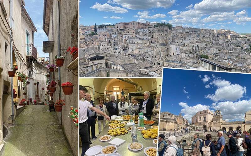 Der 1. Höhepunkt unserer Reise naht, alle sind wieder wach! Matera, eine absolut faszinierende Stadt, die lange vom Tourismus verschont bleibt. Spätestens seit der James-Bond-Film «Keine Zeit zu sterben» 2019 hier gedreht wurde, kennt jedoch die ganze Welt diese wunderschöne Sandstein-Stadt. Die meisten Höhlenhäuser stammen aus dem Mittelalter, also dem 9. bis 13. Jahrhundert. Giuseppe, ein «Materianer», führt uns durch das Labyrinth der Gässchen und zeigte uns viel Spannendes, z.B. wieso sie die Babys in den Schubladen der Truhe schlafen liessen oder wieso das Vieh im untersten Teil der Höhle lebte.