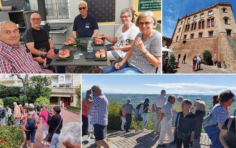 Die Stadt der hundert Türme, Alba, woher auch der köstliche Wein Barolo produziert wird, ist sehenswert. Zum Abschluss machten wir noch einen Halt in der Weinkellerei „Cascine Rossa Diano d’Alba, welche uns nicht nur die guten Weine zur Verkostung anbot, sondern auch mit örtlichen kleinen Häppchen verwöhnte. Sehr gut schmeckten der gekochte Salami, Käse und vieles Mehr. Beeindruckend war auch der imposante Film über den Weinanbau, Reben beschneiden, Weinlese und Kelterung.