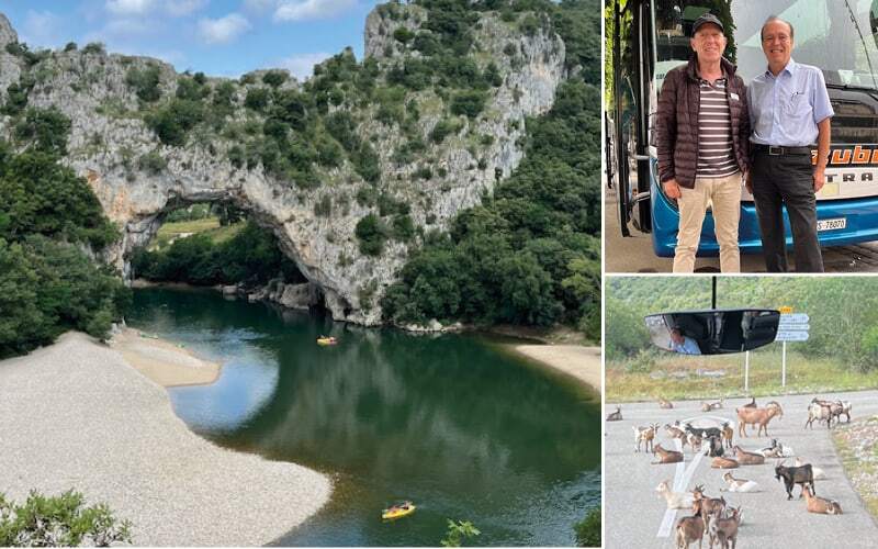 Am Mittwoch dem zweitletzten Tag steht ein Ausflug zur Schlucht von Ardèche auf dem Programm. Heute ist Alain unser Guide. Witzig und immer wieder mit einer kleinen Anekdote macht er uns mit dieser wilden Landschaft des 120 km langen Nebenflusses der Rhône bekannt. Die Schluchten erstrecken sich über 32 km. Der «Grand Canyon Europas» zieht Naturliebhaber wie Sportbegeisterte an. Kaum sind wir hoch über der Schlucht versperren sicher 50 wilde Ziegen unseren Weg, wie Klimaaktivisten die sich auf die Strasse kleben. Ein aussergewöhnliches Bild. Mit Zureden bringen wir die Herde zur Seite. Von verschiedenen Aussichtsplattformen bestaunen wir die bis zu 250 m hohen Steilfelsen und werten als Höhepunkt die von der Natur geschaffene, sehr beeindruckende Pont d’Arc.