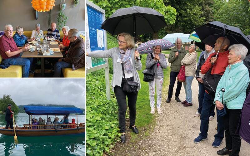 Slowenien und hier jetzt eben die Julischen Alpen. Unser Muotataler- Wetterschmöcker ist heute verdächtig ruhig. Die Fahrt im Bus durch den knapp 8 km langen Karawankentunnel nach Slowenien ist der einzige trockene Moment, den wir bis zum späten Nachmittag haben. Frau Irena, unsere Führerin in Bled, gibt sich grosse Mühe, das Geprassel unter den Regenschirmen mit ihren Ausführungen zu übertönen und wir bleiben für einmal ein wenig länger in der schönen Kirche im Trockenen. Gerade zur richtigen Zeit hellt es aber am Nachmittag auf. Die Fahrt mit den gondelähnlichen Booten auf die Insel im See erleben wir ohne Regen. Wenigstens hat es nicht so viele Leute und wir lassen den magischen Kraftort auf uns einwirken. Das Dessert im wahrsten Sinne des Wortes, folgt aber noch: Kaffee und die weltberühmten Bledercremeschnitten. Derart gestärkt fahren wir am späten Nachmittag wieder durch den Tunnel zurück nach Velden. Der höchste Berg Sloweniens, der Triglav 2864m, zeigt sich uns an diesem Tag leider nicht.