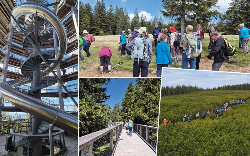 Der Baumwipfelpfad Pohorje befindet sich im Herzen der mächtigen Wälder von Pohorje, auf der Spitze von Rogla in der Höhe von 1517 Metern. Die 1km Meter lange Wanderung 24 Metern über Boden, führt uns durch den abwechslungsreichen Pohorje-Wald. Am eindrucksvollsten ist der 37 Meter hohe Turm. Wir sehen die prächtigen Bäume, die z. T. Hunderte von Jahren alt sind. Die Mutigsten unter uns haben einen kleinen Teppich mit auf die Turmspitze genommen – Rutschbahn ist angesagt! Die ganzen 24 Meter runter. Strahlende Gesichter sind das Resultat. Nun gehts zu Fuss weiter zu den Lovrenska-Seen durch Wälder mit vielen Wurzeln – Achtung Stolpergefahr, Auf- und Abstiegen. Elmar führt die „Gipfelstürmer“ an und Jakob die „Geniesser“. Bei den Seen machen wir eine kleine Pause und wandern wieder zurück zum Ausgangspunkt. Und dann! Überraschung: Beim Car schenkt Jakob einen Schnaps für Wanderfreunde, Blaubeerlik ör, für uns aus.