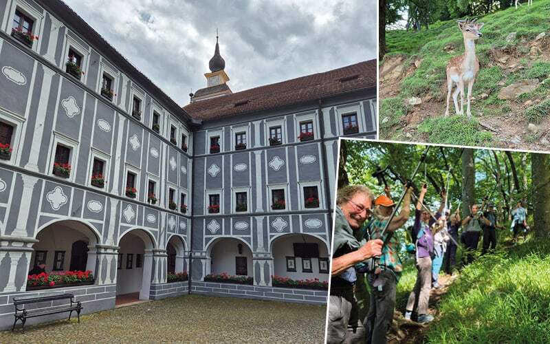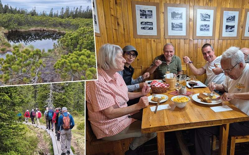 Wieder ein Aussichtsturm in schwindelnder Höhe. Gewaltig! Nun runter durch die von einem Sturm verwüsteten Wälder und die Jause wartet bereits: Nein, kein Buchweizenbrei! Es gibt „Bocki pisker“ einen Eintopf mit Gulasch und Kartoffelknödel, plus natürlich einem wunderbaren Apfelstrudel. Nach einer kleinen Wanderung zurück zum Car, heisst es auch Abschied nehmen von Helena und Alia. Heute Abend ist als Überraschung ein Galadiner geplant. Im grossen Kristallsaal erwartet uns ein Abendessen der Sonderklasse. Das „kleine“ Schwarze hat niemand dabei – das ist egal. Wir ziehen das beste Stück aus dem Koffer – wow man kennt die Gipfelstürmer/innen und Geniesser/innen kaum mehr. Auf den Tischen Kerzenleuchter auf den Tellern feine Speisen und die Musik, die zum Tanzen einlädt. Ein besserer Abschluss der Reise kann man sich nicht vorstellen.