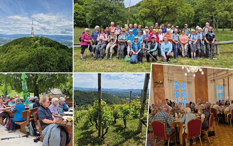 Landschaftspark Boc und Diner im Kristallsaal Helena und Alia stehen wieder munter beim Car. Das Wetter meint es wiederum gut mit uns. Bei Regen wäre die heutige Wanderung abgesagt worden – zu schwierig und rutschig. Ach, was haben wir für ein Glück! Wir steigen in unseren Car und etwas später in kleinere Busse um, die uns zur Berghütte fahren. Dort wandert ein kleiner Teil der Gruppe auf dem Rundweg über Blumenwiesen. Fotos werden gemacht und gefachsimpelt über die Bioversität. Die Gipfelstürmer/innen und Geniesser/innen wandern steil zum Gipfel des Boc, von wo wir bis zum Plattensee sehen können.