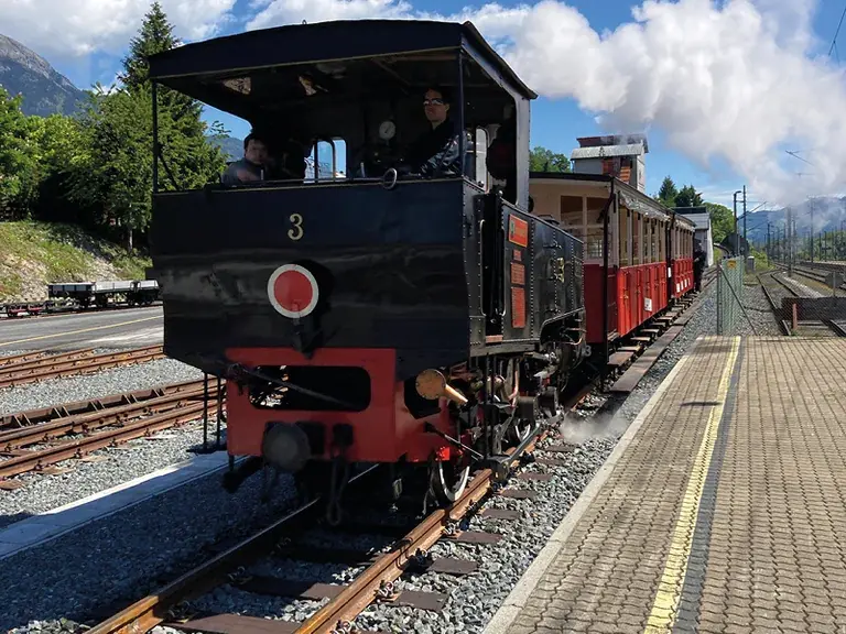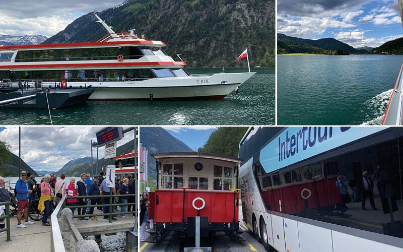 Erster Höhepunkt: Die Achenseebahn von Jenbach an den Seespitz des Achensees. Auf einer Strecke von 6,76 km überwindet sie als Dampfzahnradbahn 440 Höhenmeter mit teilweise 16 % Steigung. Der Zugführer klettert dabei wie ein Zampano während der Fahrt von einem Abteil zum anderen um die Tickets zu lochen und sorgt so für zusätzliche Unterhaltung. Mit zischen und dampfen fahren wir, in reservierten Wagen, durch eine wunderschöne Landschaft hinauf an den See.