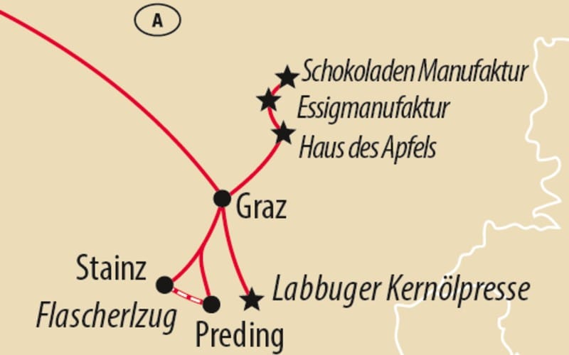 Heute dreht sich alles um die kulinarischen Schätze der Region. Zuerst besuchen wir das Haus des Apfels und erfahren Spannendes über die steirische Apfelstrasse. In der Essigmanufaktur verkosten wir Spezialitäten aus über 60 Essigsorten, bevor wir in der Schokoladenmanufaktur Felber einen exklusiven Blick hinter die Kulissen werfen – inklusive süsser Kostprobe. Am Abend geniessen wir beim Mostwirt steirische Spezialitäten in geselliger Atmosphäre.