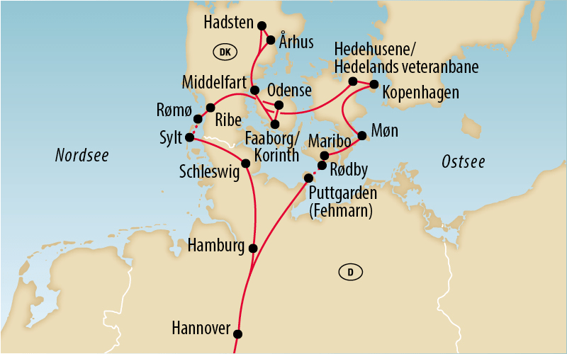 Märchenhafte Inseln, endlose Sandstrände, malerische Hafenstädtchen und nostalgische Bahnfahrten – diese Reise vereint die schönsten Seiten Dänemarks. Wir entdecken die Weite von Sylt, die Märcheninsel Fünen, die pulsierende Hauptstadt Kopenhagen, die Kreidefelsen von Møn und das idyllische Lolland. Drei Museumsbahnen lassen uns reisen wie zu Grossvaters Zeiten: die Syd Fynske Veteranjernbane, die Hedelands Veteranbane und die älteste Bahn Dänemarks zwischen Maribo und Bandholm. Dazwischen erwarten uns kulturelle Höhepunkte, Fischbrötchen am Meer, charmante Altstädte und dänische Lebensfreude pur!