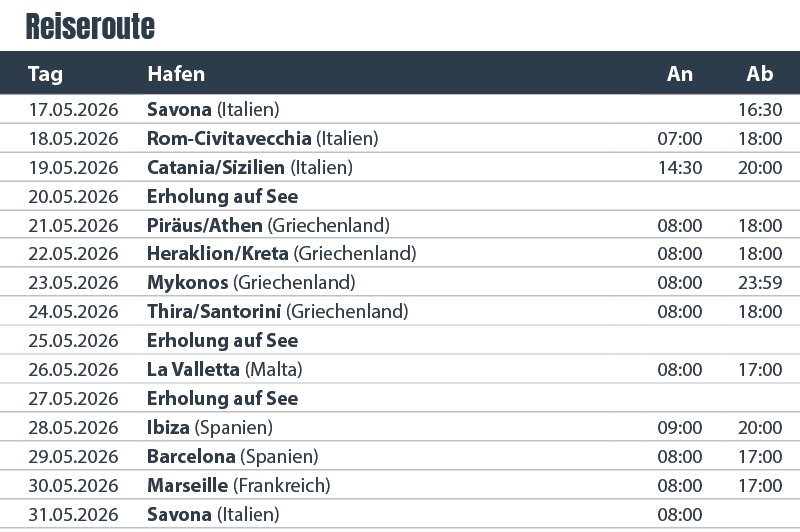 Unsere beliebteste Route im Mittelmeer führt über Rom und Sizilien nach Athen und zu den schönsten griechischen Inselperlen. Ob Kreta, Mykonos oder Santorini – jede Insel hat ihren eigenen Charme und wird Sie begeistern! Wir verbringen herrliche Sonnentage an Deck und lassen es uns so richtig gut gehen, bevor wir zum Abschluss durchs westliche Mittelmeer gleiten und mit Malta, Ibiza, Barcelona und Marseille vier weitere Höhepunkte erleben – traumhaft! Nutzen Sie die Gelegenheit und sichern Sie sich jetzt die begehrten Plätze für diese grossartige Kreuzfahrt zum Aktionspreis!