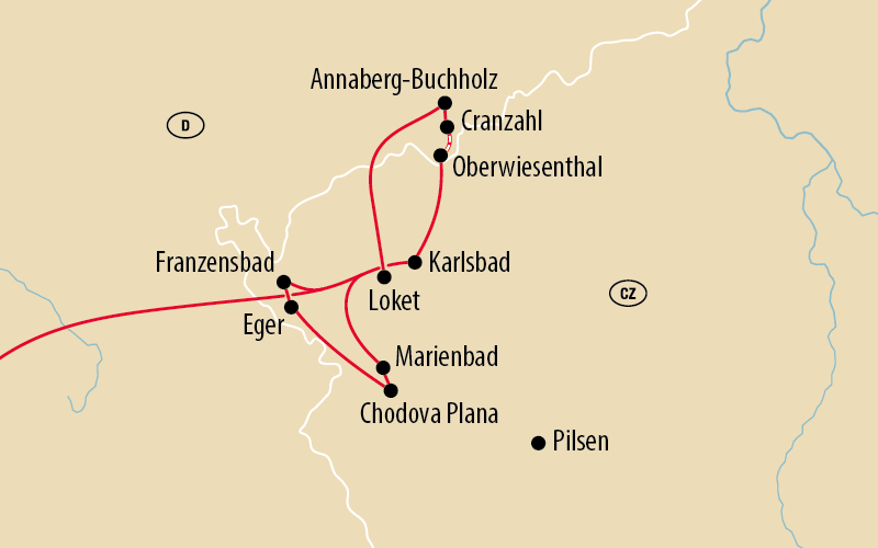 Eine Tagesfahrt durch das Bäderdreieck: Wir besuchen das elegante Marienbad, stärken uns mittags im Felsenrestaurant mit böhmischer Küche, spazieren durch das geschichtsträchtige Eger – und erleben zum Abschluss Franzensbad mit seiner herrlich nostalgischen Kurarchitektur.