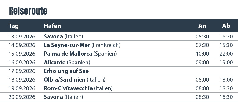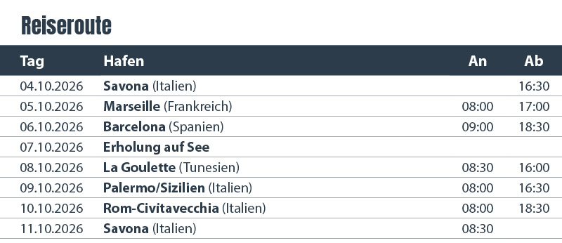 2. Tag: Marseille/3. Tag: Barcelona/4. Tag: auf See/5. Tag: La Goulette, Tunis/6. Tag: Palermo