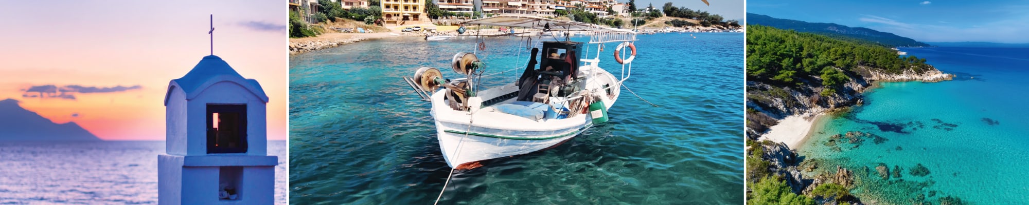 Chalkidiki - drei Landzungen ragen wie Finger tief in das ägäische Meer: Sithonia, Kassandra und die Mönchsrepublik Athos. Pinienwälder reichen von den Bergen bis zum kristallklaren Meer. Dazwischen schmiegen sich einsame Buchten und idyllische Fischerdörfer mit kleinen Tavernen. Eine Szenerie, die auf Postkarten nicht schöner sein könnte! Sichern Sie sich jetzt Ihre Plätze für wunderbare Frühlingstage unter der griechischen Sonne!