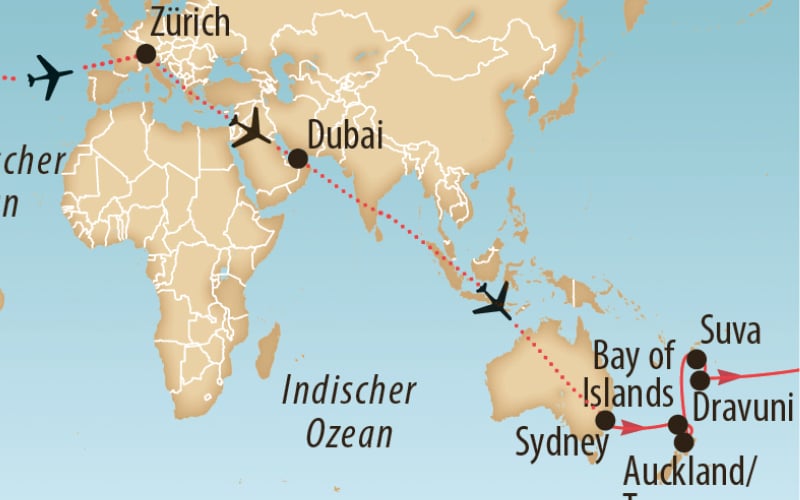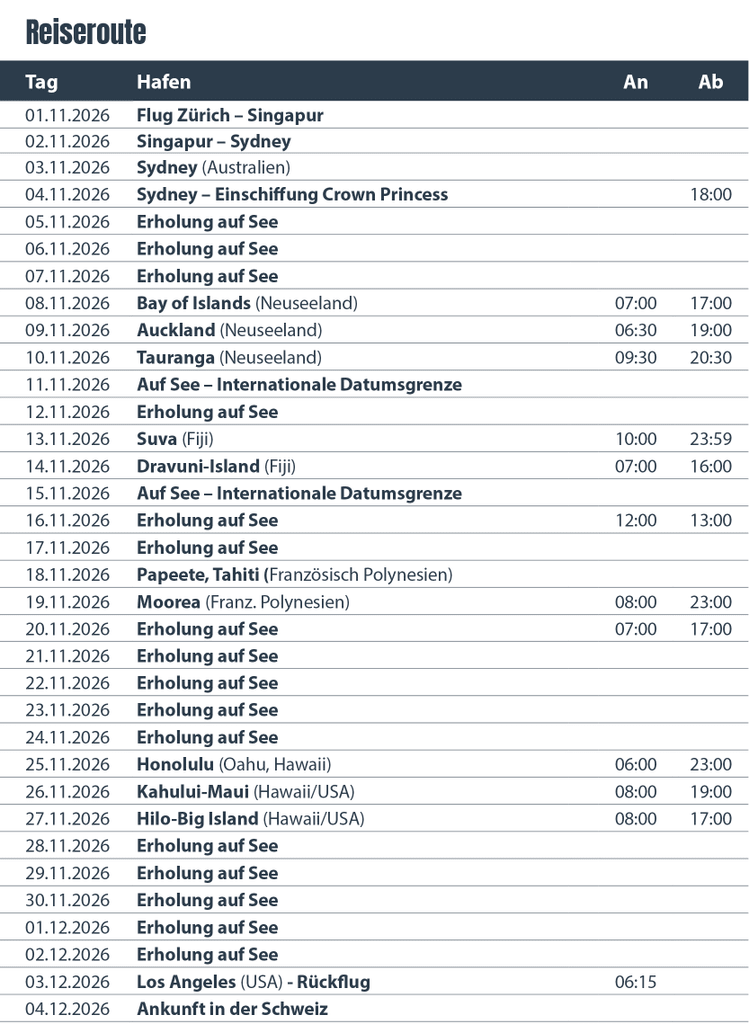 Willkommen an Bord zu dieser einzigartigen Reise rund um die Welt zu einem einmalig günstigen Preis! Die faszinierende Weltstadt Sydney bildet den Auftakt unserer Weltreise. Unvergesslich wird die Ausfahrt aus dem Hafen von Sydney mit Sicht auf das Opera House und die Harbour Bridge, bevor uns die Nordinsel Neuseelands erwartet. Fiji, Tahiti und Moorea – das sind kristallklare Lagunen, smaragdgrüne Berge und eine einzigartige Blütenpracht, die unsere Herzen höher schlagen lässt. Nach eindrücklichen Vulkanlandschaften und romantischen Sonnenuntergängen auf Hawaii bildet Los Angeles den krönenden Abschluss unserer Reise, an die Sie sich immer erinnern werden!