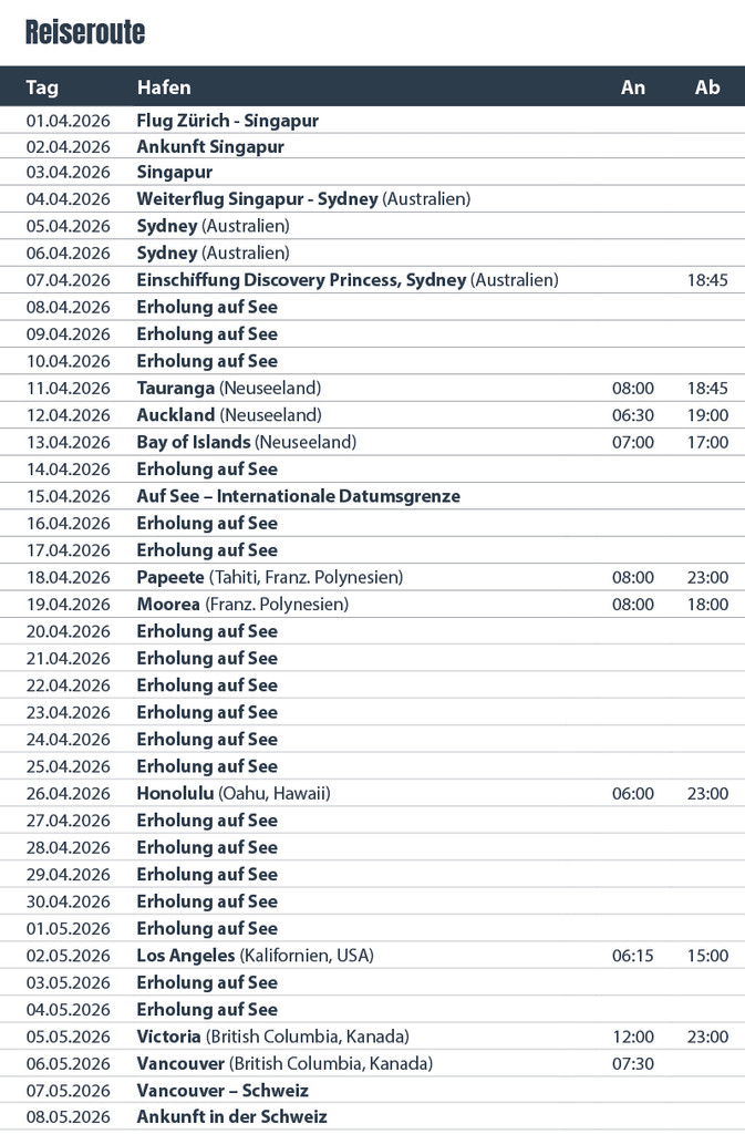 Willkommen an Bord zu dieser einzigartigen Reise rund um die Welt zu einem einmalig günstigen Preis! Singapur, eine der faszinierendsten Städte der Welt bildet den Auftakt unserer Weltreise. Unvergesslich wird die Ausfahrt aus dem Hafen der Weltstadt Sydney mit Sicht auf das Opera House und die Harbour Bridge. Die Nordinsel Neuseelands erwartet uns mit Vulkanen, grünen Schafweiden und heissen Quellen. Kaum eine Region der Erde ist so sehr Sehnsuchtsziel wie die Südsee. Tahiti und Moorea, das sind kristallklare Lagunen, smaragdgrüne Berge und eine einzigartige Blütenpracht, die unsere Herzen höher schlagen lassen. Auf Hawaii bestaunen wir die atemberaubenden Vulkanlandschaften und freuen uns auf die wohl schönsten Sonnenuntergänge, die man sich vorstellen kann. Vancouver bildet den krönenden Abschluss unserer Reise, an die Sie sich immer erinnern werden!