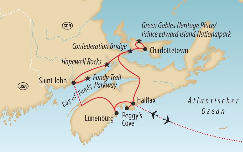 Eine Reise voller Weite, Wind und Wunder erwartet uns: Wir spazieren durch Charlottetown, die «Wiege Kanadas», staunen über die weltberühmten Wasserstände der Bay of Fundy, fahren entlang wildromantischer Küstenwege und besuchen Orte, die wie Postkartenmotive wirken – von den legendären Hopewell Rocks bis zum Leuchtturm von Peggy’s Cove in Nova Scotia. Lunenburg begeistert mit farbenfroher Holzarchitektur, Prince Edward Island mit sanften Hügeln und der Welt von Anne of Green Gables. Ein maritimes Abenteuer voller Natur, Geschichte und unzählbarer Wow-Momente.