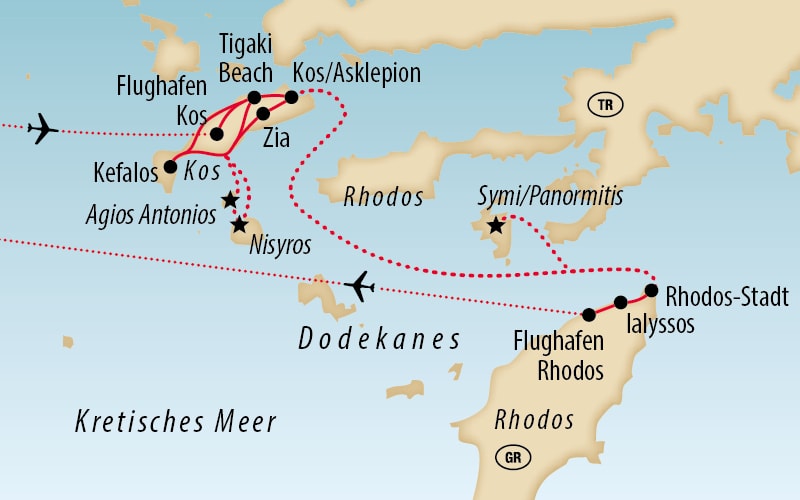 Diese einzigartige Kombination aus Kos und Rhodos vereint zwei der schönsten Inseln der Ägäis. Auf Kos entdecken wir die Ursprünge der Antike und idyllische Dörfer – und wagen sogar einen Blick in den aktiven Vulkan von Nisyros. Rhodos begeistert mit einer mittelalterlichen Altstadt, sanften Buchten und dem farbenfrohen Hafen von Symi. Elf traumhafte Tage, vier sorgfältig ausgewählte Ausflüge und angenehm viel Freizeit machen diese Reise ideal für alle, die Griechenland intensiv erleben und zugleich entspannt geniessen möchten.