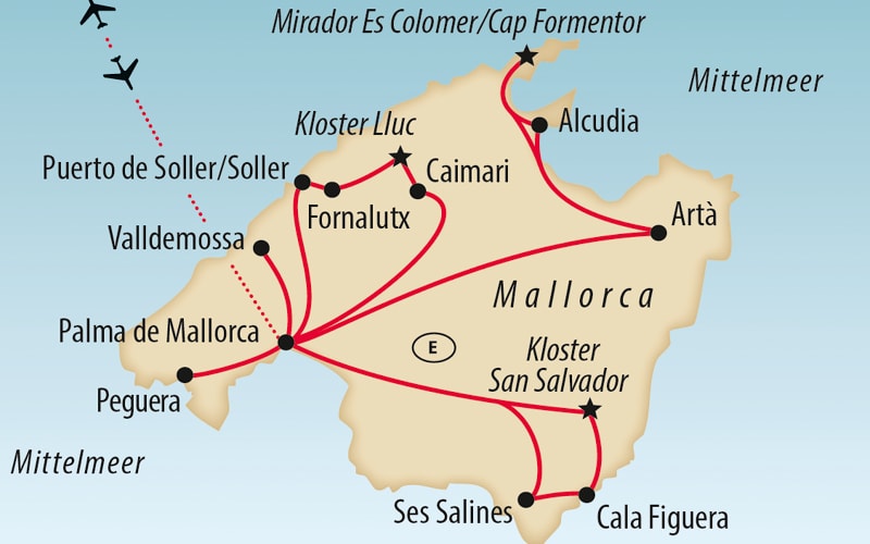 Die wildromantische Serra de Tramuntana zeigt sich zur Mandelblüte von ihrer schönsten Seite. Wir besuchen eine Ölmühle in Caimari, besichtigen das Kloster Lluc und erreichen über die spektakuläre Küstenstrasse das Bergdorf Fornalutx. Mit der historischen Strassenbahn geht es durch das „Goldene Tal“ bis nach Soller – ein Ausflug wie aus einem Bilderbuch.