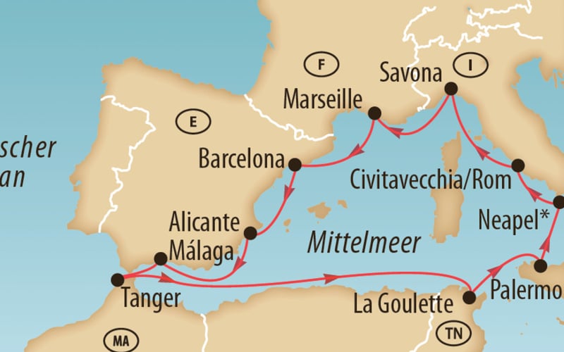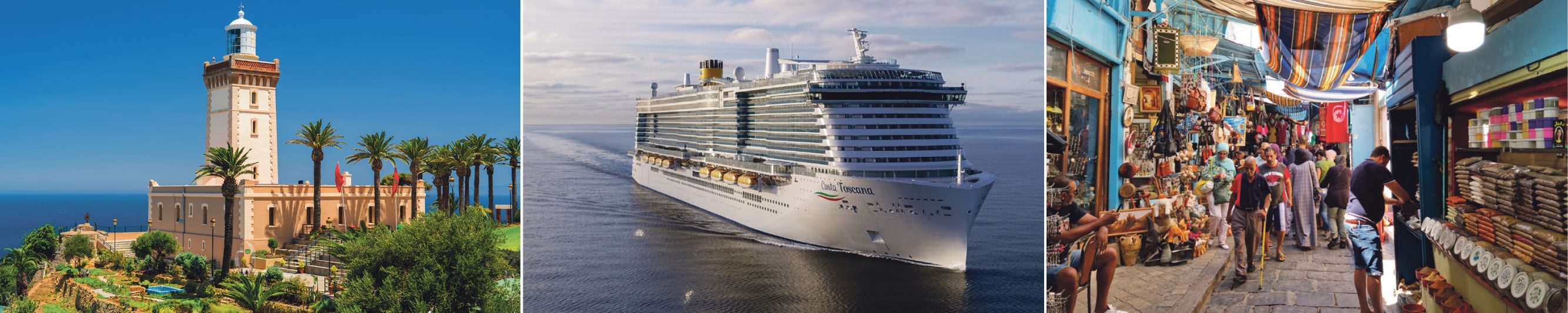 Sichern Sie sich jetzt Ihren Platz an der Sonne und profitieren Sie von unseren einmaligen Aktionspreisen auf der erstklassigen Costa Toscana! Entfliehen Sie dem trüben Winterwetter und nehmen Sie Kurs auf spannende Reiseziele im Mittelmeer. Sonnenverwöhnte Küsten, abwechslungsreiche Landschaften und malerische Hafenstädte erwarten uns. In Tanger und Tunis lassen wir uns vom orientalischen Flair verzaubern und gehen auf Entdeckungstour durch die farbenfrohen Märkte. Greifen Sie rasch zu, die Platzzahl ist beschränkt!
